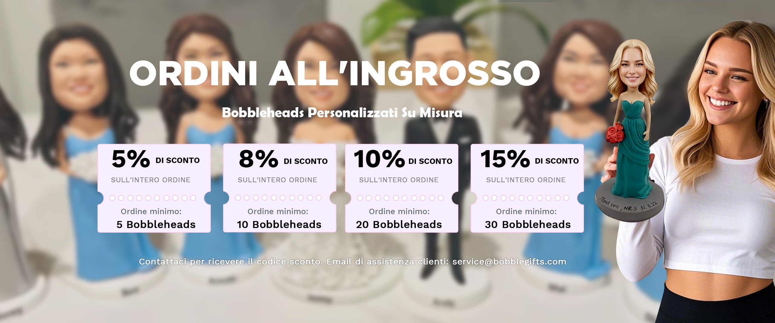 Il nostro sconto per ordini all'ingrosso per clienti privati che effettuano ordini superiori a 800€. Contattaci (via email: service@bobblegifts.com) e ti risponderemo il prima possibile.